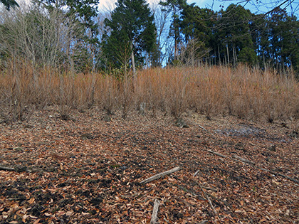 道中。左の立木には緑(上の写真では青)のテープで固定された監視カメラ、右手前の岩の下にはポッカリと穴。穴に何がいるんだろう? そうっとすみやかにさっさと立ち去る。