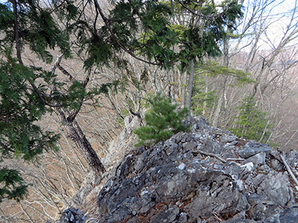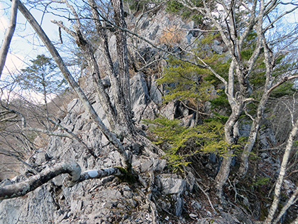 岩の出現。両側はシュパッと切れ落ちているけど、木が多いので高所恐怖症の私でもそれほど恐怖を感じずに進める。