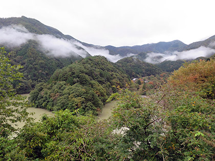 下流側。雲海を侍らしているあの山は月夜見山。湖水の色はおいしそうなコーヒー牛乳の色そっくりでした。