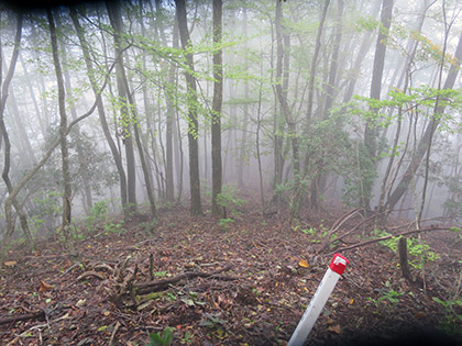 かつての道は崩落したのでしょうか。赤テープが土砂に埋もれつつありました。