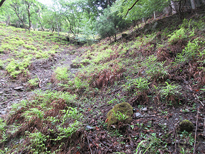小川谷上段歩道に降りました。これにて篶坂ノ丸北東尾根はおしまいです。ポコリとした小さなピークの向こうは材木小屋窪の二俣分岐に落ち込んでいるはずです。次は金袋山東尾根です。小川谷上段歩道を東へ下ります。
