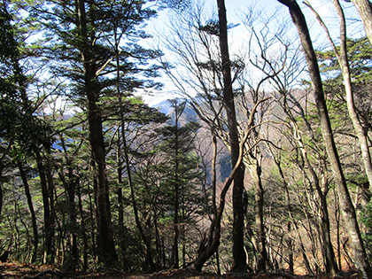 西方向の景色。ほうじ茶を飲みながらちょっと思案。ほぼ記憶にはないけれど峰谷橋に向かう尾根は以前に歩いたことがあるので、ここから南西に下る尾根を歩いてみてはどうだろうか。反対意見なし、満場一致で南西に留浦集落を目指して下ることに決定。これにて赤指尾根はおしまいということにあいなりました。