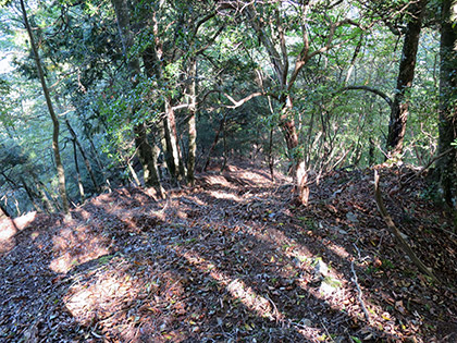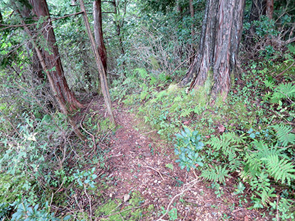末端からちょっと戻ったところにはっきりした道が右下へ戻るように延びていました。僥倖です。下調べでは林道への着地に関する情報は見つけられませんでした。これは林道に下りる道に違いありません。