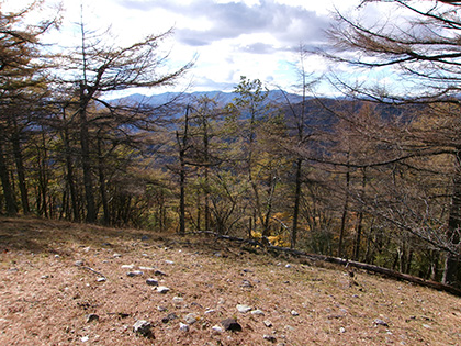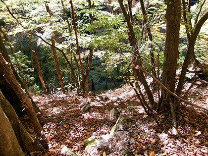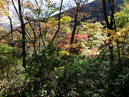 狩倉山南尾根は上部をほんの少し石尾根と重複した後、右(南東)へかなりキツい勾配で下っています。右手の小中沢側に激しく切れ落ちていたりもします。小中沢側は雑木が多く、西日が黄色い葉っぱを照らしてとてもきれいでした。