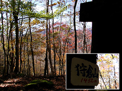 東京農業大学のロープをくぐったちょっと先に「狩倉山」の山名板があります。1452mの標高点が設定されています。