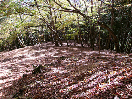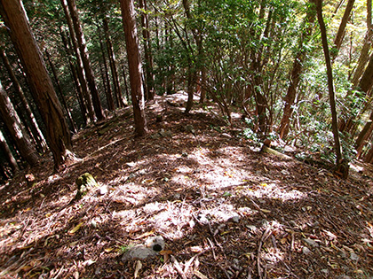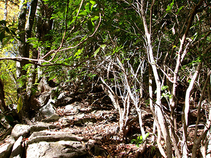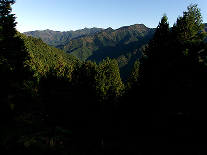 下ります。先が見えません。急降下がはじまりそう。右手が雑木になりました。傾きはじめた西日が尾根に木々の影を落とします。