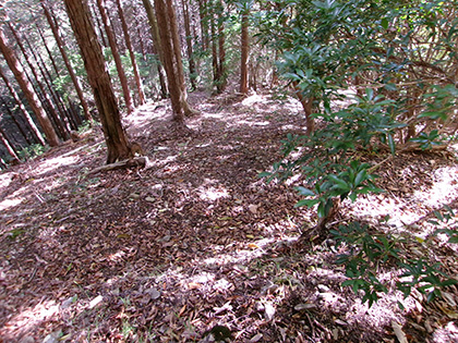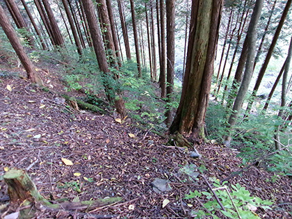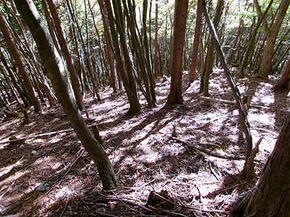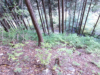 左手の植林帯へじんわりじんわりトラバース(山腹水平移動)。錯綜している薄い踏み跡をテキトーにたどります。