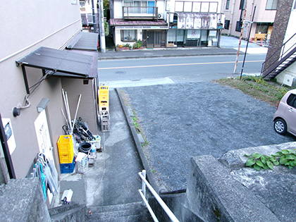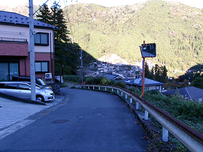表参道の急な石段を降りるのはちょっと怖いので南氷川の集落を通る道路を下ります。奥多摩駅が日陰になったばかりです。