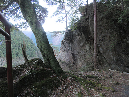 数馬の切通しです。岩盤の上で火を焚き水をかけて脆くなったところをツルハシや石ノミで切り開いた、ということが奥多摩町教育委員会の案内板に書かれていました。工事が始まったのは元禄の頃で、改修を経て、大天狗神社の巨岩のさらに上を山越えしなくてはならなったのがめちゃくちゃ楽になったそう。せっかくなので古人の偉業を偲びつつ行って戻って行きました。