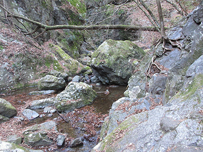 第4の滝、不動の滝へのアプローチは大滝の右岸を巻くらしい。大岩の向こう側の