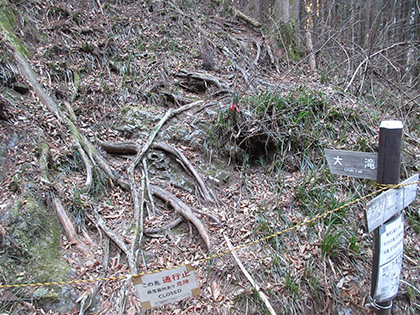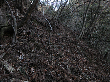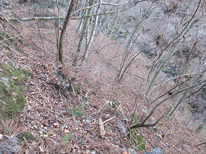 ガリ(ここでは雨水で侵食された溝のこと。ショウガではありません。ガリー、雨裂とも)を這い登るのもアプローチのひとつらしい。岩肌が見えているところがあります。滑りそうです。今度は額を打ってしまいそうなので左の小尾根に取付くことにしました。淡いけれど芯のある細い踏み跡(おそらくかつての海沢探勝路)をちょっとたどり、尾根に向かって