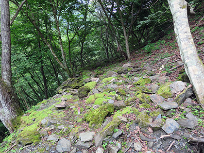 ビビっていたところ、木と木の間にロープが渡されていました。これならなんとか先に進めそうです。やっぱり小川谷林道の先の山道に似ています。ひょっとしてこのロープもM氏の仕事じゃないでしょうか。感謝です。