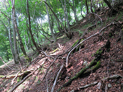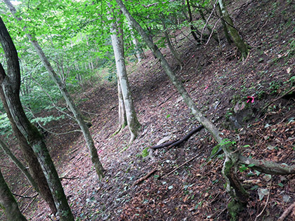 ノッペリ感はありますが、このあたりは斜度はそれほどでもないのでまーまー普通に歩けます。下山してからふと思ったことですが、ズーッと続いていた赤テープは林道建設のための測量用じゃないでしょうか。そーとー奥まで林道は延びそうです。