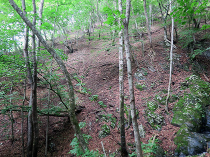 下流(長沢谷との出合い)方向。つまりナギ谷オキ尾根の下端方向です。