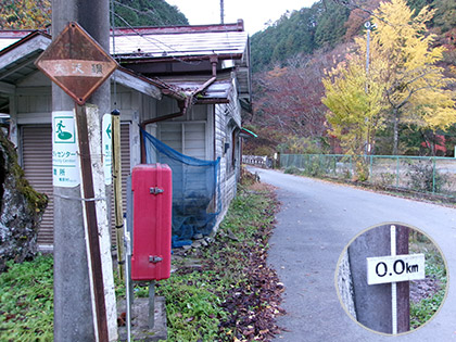 そばの電柱には古い「林道矢沢線」の林道標がくくりつけられていて「0.0km」の標識が立っていました。写真奥に見える