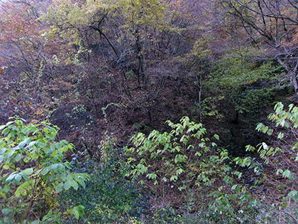 矢沢の上流に前回下った茅丸(かやまる)北尾根が見えます。右のぽこりとしたピークが茅丸です。紅葉をまとって左に下り、とんでもなくデンジャラスだった下端部が隠れています。それほど広範囲を望めないんですがいい景色です。なんとかココアをぐびりと飲みます。