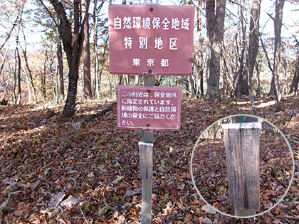穂山地域の看板と「長尾尾根844m(軍刀利山北尾根)」の木札。