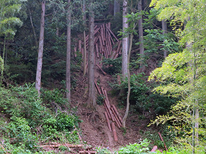 右は道はあるようなないような尾根。地図を見るとこちらの右のほうが県道(521号線)に着地しやすそうなんですが、