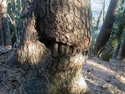 ヨコスズ尾根の登山道は最上部を除けばほぼ尾根上を通りません。けれどもそれはそれ。下部の植林帯のくの字くの字に飽きるにしても、落ち葉に埋まりながら山歩きを楽しめました。(できるだけ尾根上を歩いた記録がこちら。登山道とはまったく違う風景が待っていました)