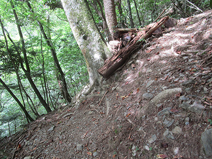 ボロボロの桟道を越えてすぐ、前回、イモリ谷左岸尾根の取付まで決死の激下りを開始したポイントを通過します。