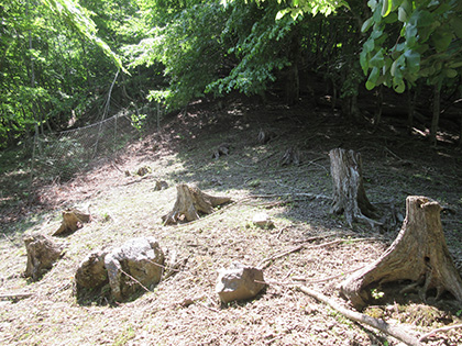防獣ネットはすぐに尾根の向こうに曲がっていきました。やがて小尾根の上から小さなクマが下ってきました。親グマが子グマを待っていたようです。子グマが傾いた倒木をとてとてとてと下ってくると、親子そろってゆっくりとカラ沢尾根のほうへ歩いていきました。