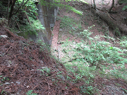 数年前に歩いたときは堰堤の前をこわごわ歩いた崩落地なんですが、手前に巻道ができていて
