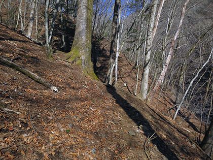 先に進むと赤帽白杭が立っている斜上する道が尾根筋に向かっています。榛ノ木沢右岸尾根は下のほうで3つに分岐しているんですが、先ほどの岩ゴツゴツ(一つめ)よりはこちらがはるかにグッドです。実は今朝、電車内で「奥多摩のトップガンMさん」と会い、最下部は「んー、あの坂を下るのは厳しいですよー」と、呟いたのがこの尾根です 。大月方面に行くという
