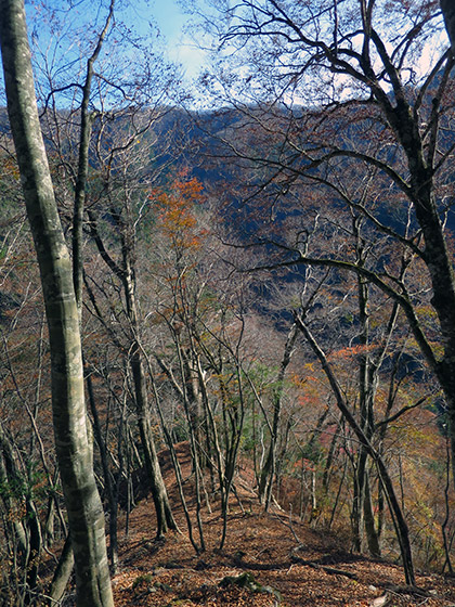 人形山東尾根は前回にちょっとだけ歩いています。小川谷右岸の上段歩道を歩くために、小川谷林道から登ったのが人形山東尾根の下のほうです。てっぺんはタワ尾根の人形山。下半分くらいはややヤセていてゴツゴツした尾根ですが、上の方は急登はあるものゆったりとして広ーい尾根が広がっていました。紅葉はほとんど終わっていましたが、なんとも心地よい尾根でした。