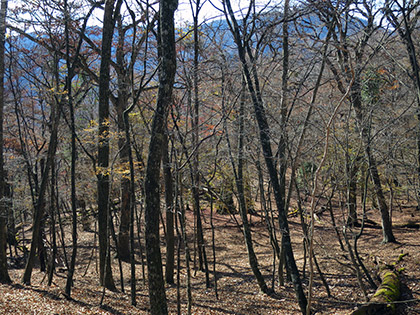 篶坂ノ丸東尾根は単調といえば単調な尾根でした。ただ、葉を落としたまばらな木々を見上げながらの幅広い尾根はそれはそれでテキトーに歩けて楽しく、振り返るたびに目に入る長沢背稜がどっしりと横たわる様はなかなか見応えがありました。