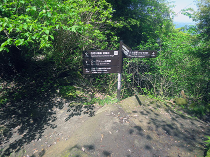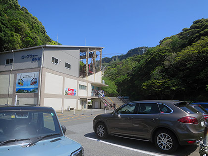 展望台から西口管理所まで降り、日本寺の境内から出ました。管理所の方に明鐘岬までの道があるのかたずねてみたんですが、「聞いたことがない」との返事。さらにイラストマップで気になっていた山頂駅あたりから海辺の国道までのびている「鋸山裏登山道」についてたずねたところ「封鎖されているんじゃないでしょうか」との返事。うーむ、ちょっと雲行きが怪しいです。西口管理所の前は有料の登山自動車道の終点で広大な駐車場になっています。最悪の場合、登山自動車道を歩いて下ろうかと思ったんですが、歩行禁止の看板が立っていました。うーむ。