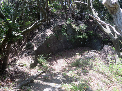 途中の石切場跡。良質な石を切り出せる地層を追って掘り進んだ結果、こんな地形になったといいます。