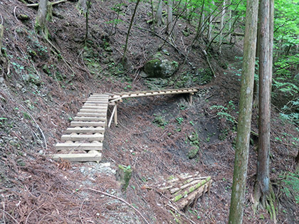 念のためにもう少し登ってみると左から道がやってきて右に見える桟道に続いていました。どうやら小尾根の手前に登ってくる道があったようです。