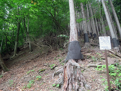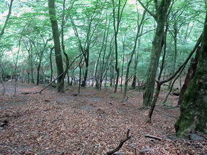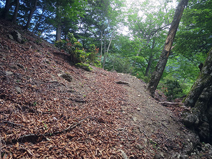 シオ沢右岸の巡視道をずーっと歩きます。いくつもの尾根と谷を越え、数か所ののっぺり道もあったりしながらぐんぐん高度を上げていきます。気が付くとハルゼミの鳴き声が谷間を埋めつくしていました。
