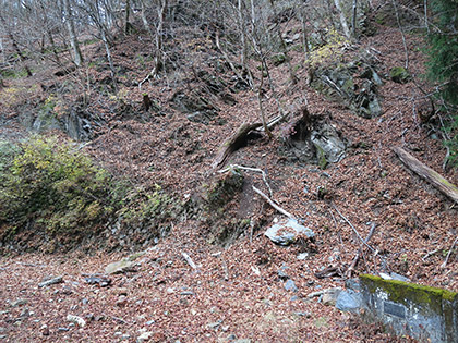 戻って仕切り直しです。取り付きはここ。倒木(誰かが引きずってきたのかな)と石垣の隙間を足がかりに、180センチほどの擁壁を登ります。