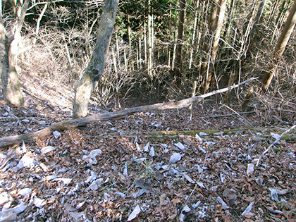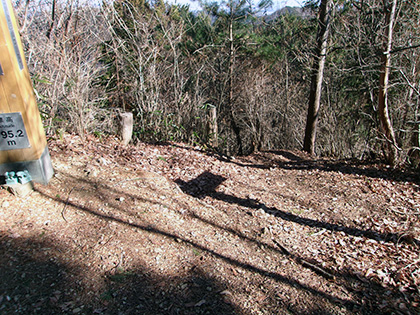 都心方向がちらりと眺められます。決定先延ばし作戦に白黒つける時です。臼杵山を経てグミ尾根から下る伝名沢左岸尾根は諦め、決定先延ばし作戦の会議で気になっていた市道山から北東にのびる破線を下ることにしました。破線は千ヶ沢の源頭から千ヶ沢を忠実にたどり、千ヶ沢林道までつづいています。このルートならいくら時間がかかっても日没前に林道に出られるはずです。