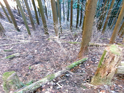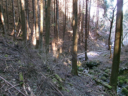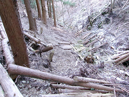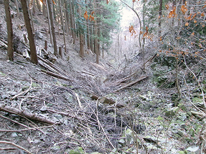 市道山から北東にのびる地形図の破線に道はございません。廃道というか消道というか、冒険チックな破線もどきを倒木や伐採木がぐしゃぐしゃと折り重なる谷筋をひたすら下り、障害物がなくなると谷底や右岸や左岸をテキトーに下っていきます。