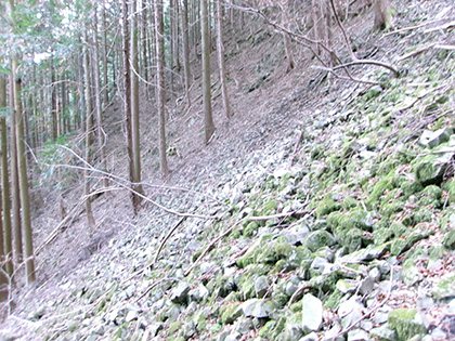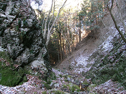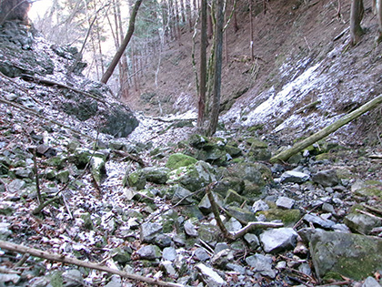 ガレ場の向こうに踏み跡がつづいているようないないような。けれども千ヶ沢からはなれると千ヶ沢林道に着地できなくなります。