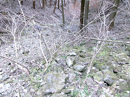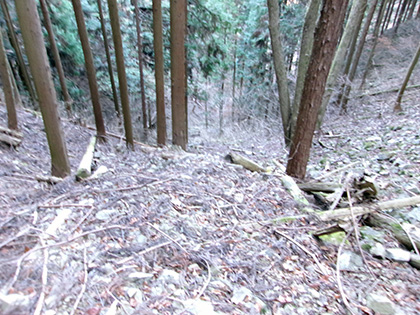 谷筋をできるだけはずさないように歩きやすいところをテキトーに下っていきます。地形図の破線はあっという間に雲散霧消です。破線はあるけれども道はない、という悲しい現実です。