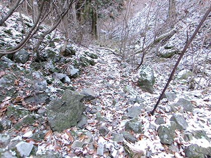 下るにつれ雪が増えてきました。かつてはしっかりした道だったみたいな道が現れ、