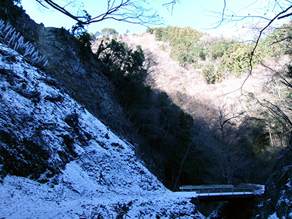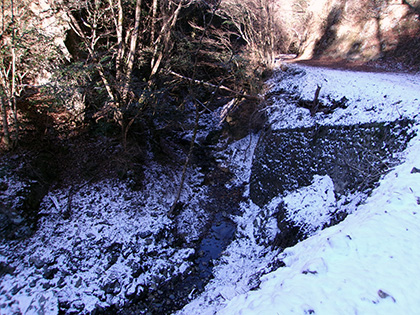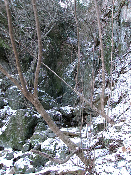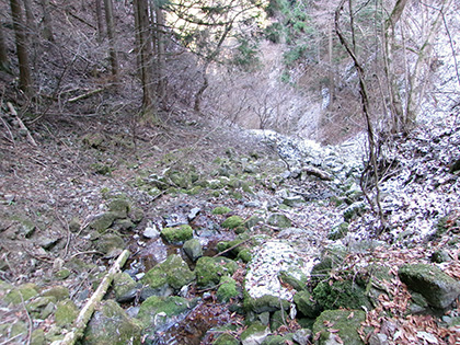 岩壁の上から沢を覗き込んでみました。細い急峻な滝がかかっています。