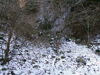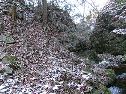 両岸から突き出た岩壁の向こうは見渡せません。踏み跡が左岸を登っています。たどります。