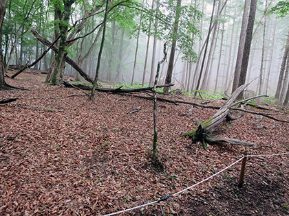 歩いて行くとロープが張られていました。ロープの向こうは急激に落ち込んでいます。ロープが巻き付けられている木の左を進みます。