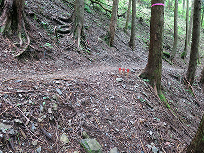 前の前の写真の赤テープから右にトラバースして隣の尾根に移ります。Mマップのルートも「そんな感じ」です(切り替え画像は該当部分のMマップ)。