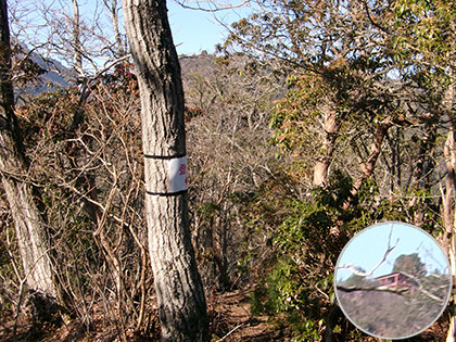 ザックを担ぎます。行く手正面の稜線上に赤い竜宮城みたい(違うかな)な建物が見えます。展望台です。地形図を見ると標高差は80mほどしかありませんがずいぶん高い所に見えます。