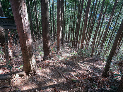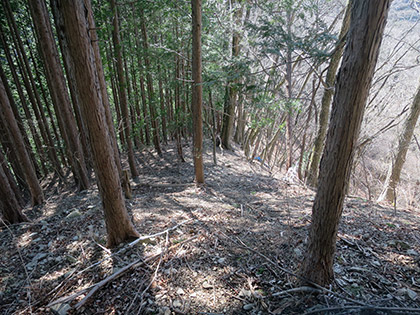 仲ノ平分岐尾根のてっぺんは浅間尾根の1018mの標高点で、ほぼ真南に下っています。『詳細図』にも『山と高原地図 奥多摩 2012年版』(昭文社)にも地形図にも掲載されているルートですが、下端部で尾根をはずれるまではほぼずっと尾根上にルートがあるという、いわゆる一般登山道としてはありそうであまりないタイプです。