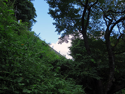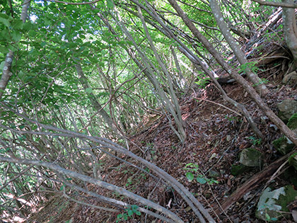 尾根のちょっと下をトラバースするように進みます。尾根のてっぺんは擁壁のてっぺんで、あまり近づきたくありません。