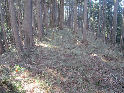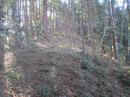 尾根を回り込むようにもう少し先に歩いてみると両側に竹が積まれた階段がありました。ここから取付きます。