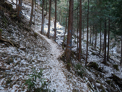 作業道らしき道にぶつかりました。あまりに傾斜がキツいのでたどることにします。