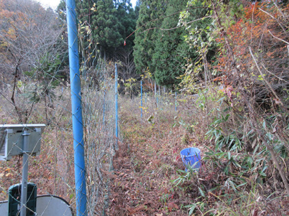 耕作されていない畑に張り巡らされた防獣ネットを回り込みます。