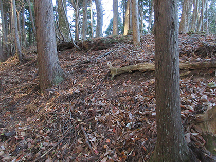 下ってくると炭窯跡がありました。焚き口のようすがよくわかります。この山域はワサビ田跡も多いし、一大産業拠点だったのかもしれません。